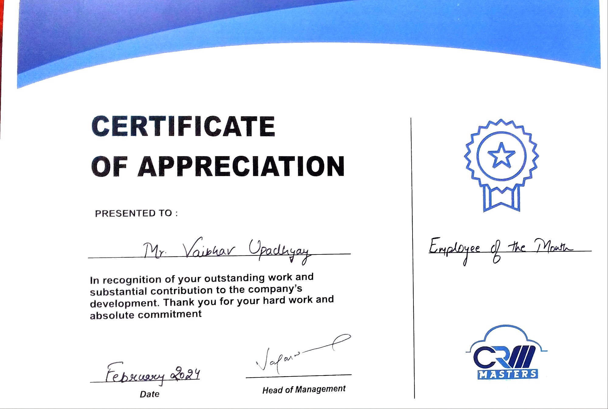 I received the "Employee of the Month" award for February, recognizing my exceptional performance and contributions as a Software Engineer.