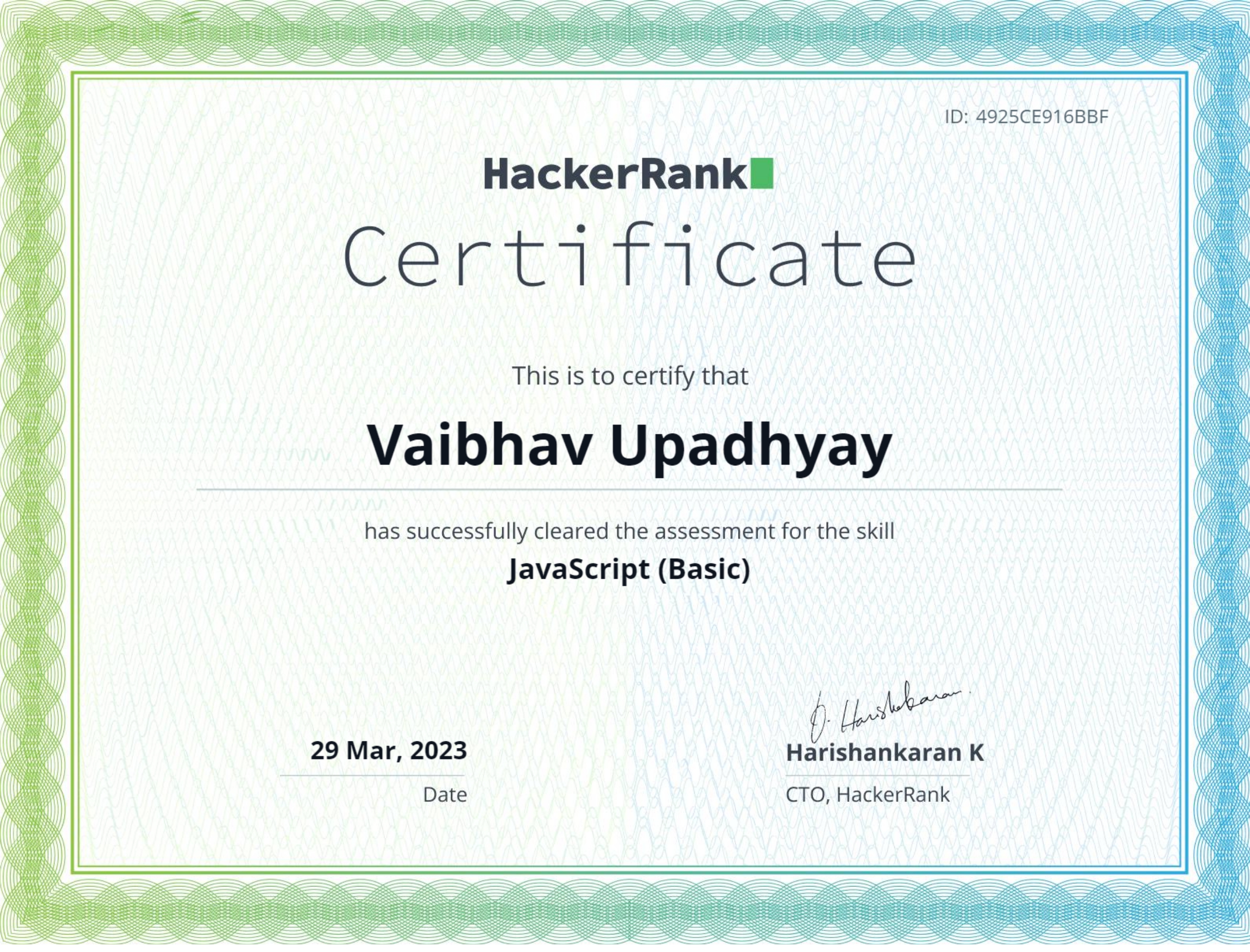 Successfully earned an Basic-level Javascript Certification through HackerRank, a prestigious platform known for its coding challenges and technical assessments.