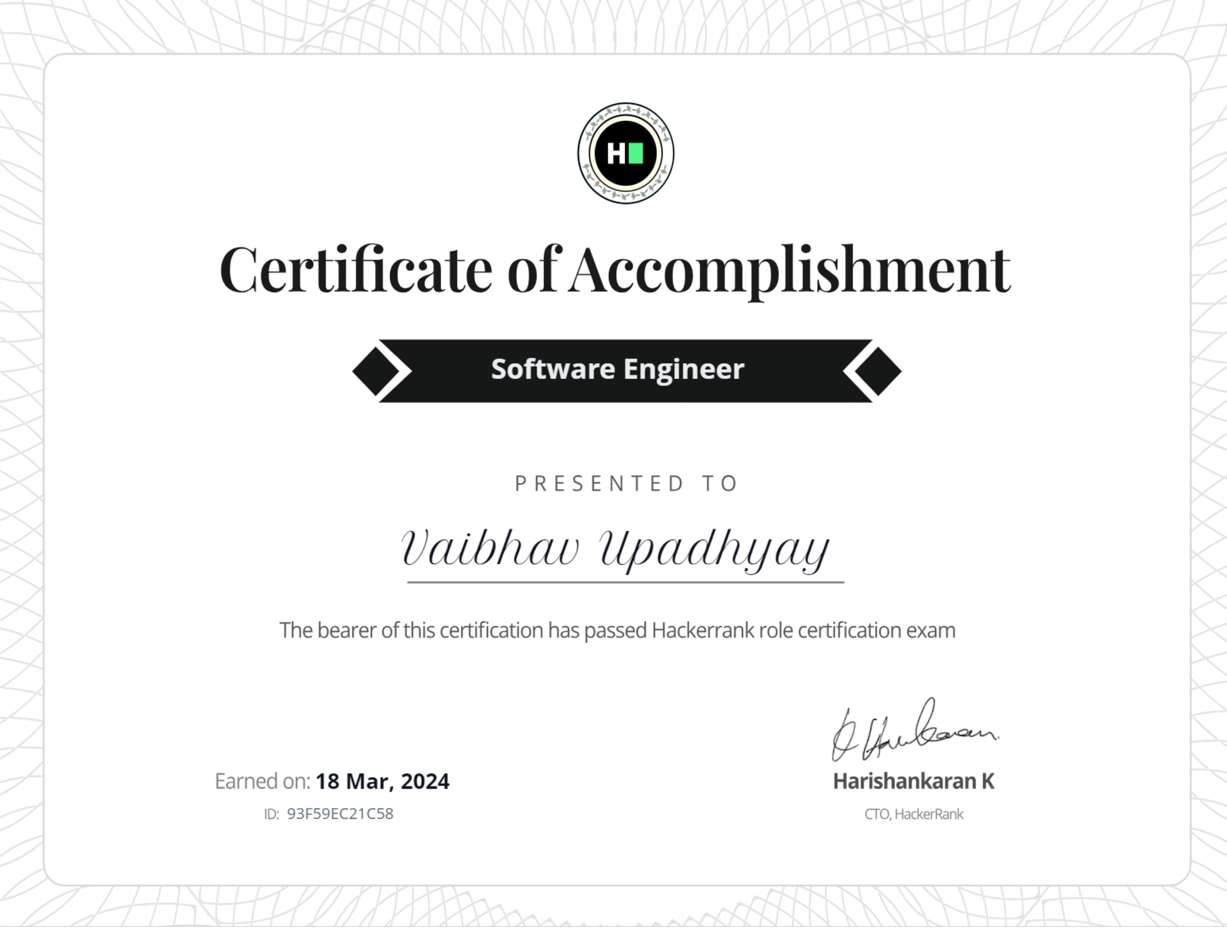 Successfully Completed the "software engineer" position test on HackerRank, where I earned a certificate along with a badge.
