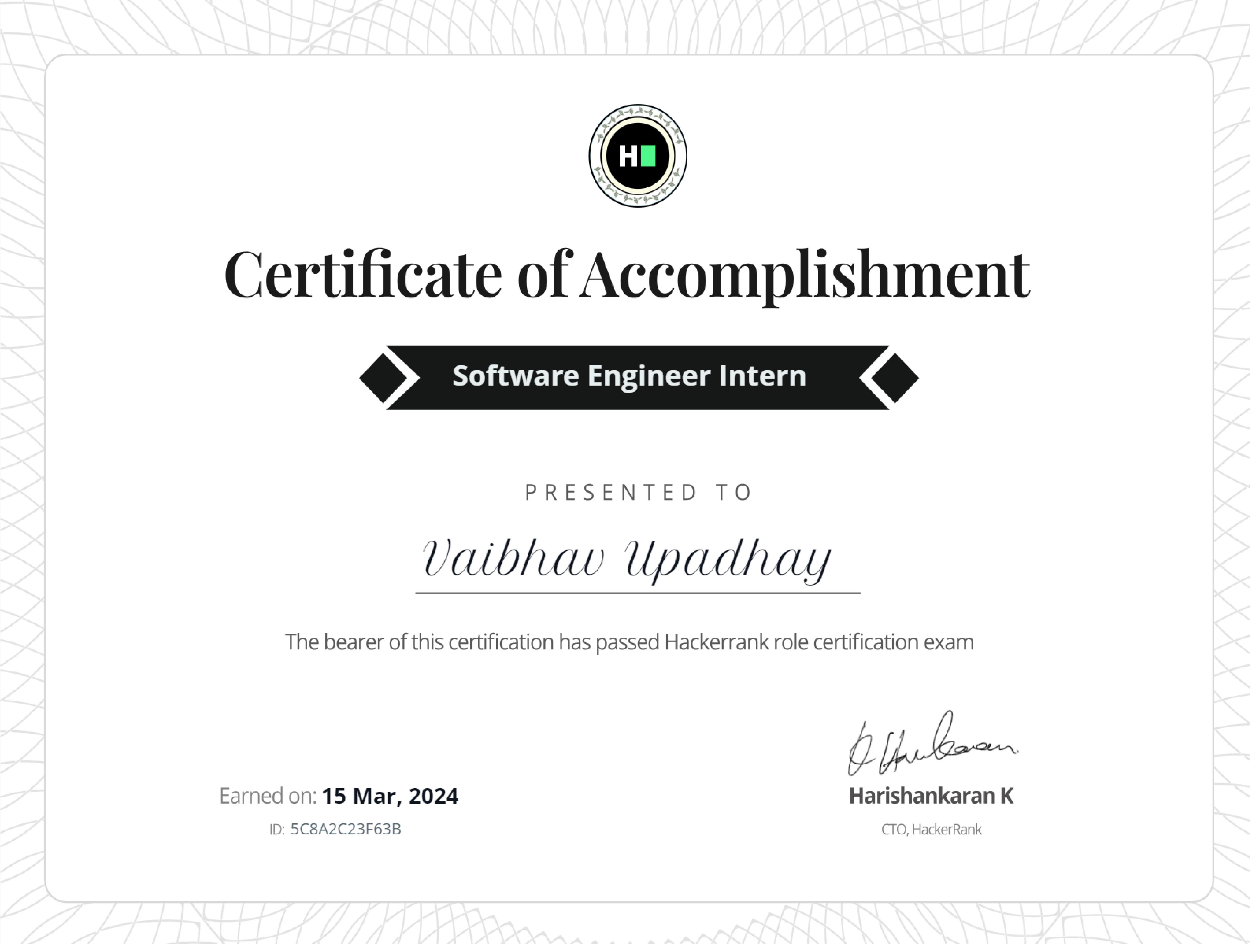 Successfully Completed the "software engineer Intern" position test on HackerRank, where I earned a certificate along with a badge.